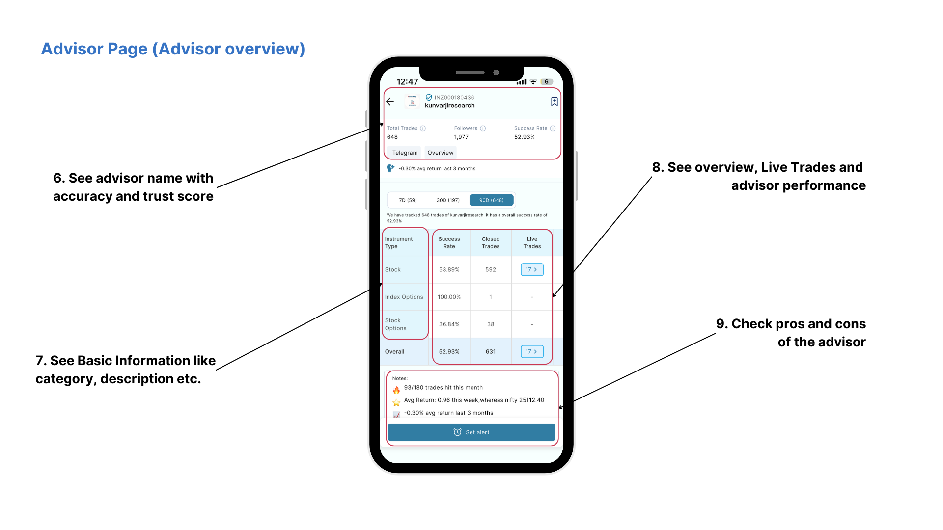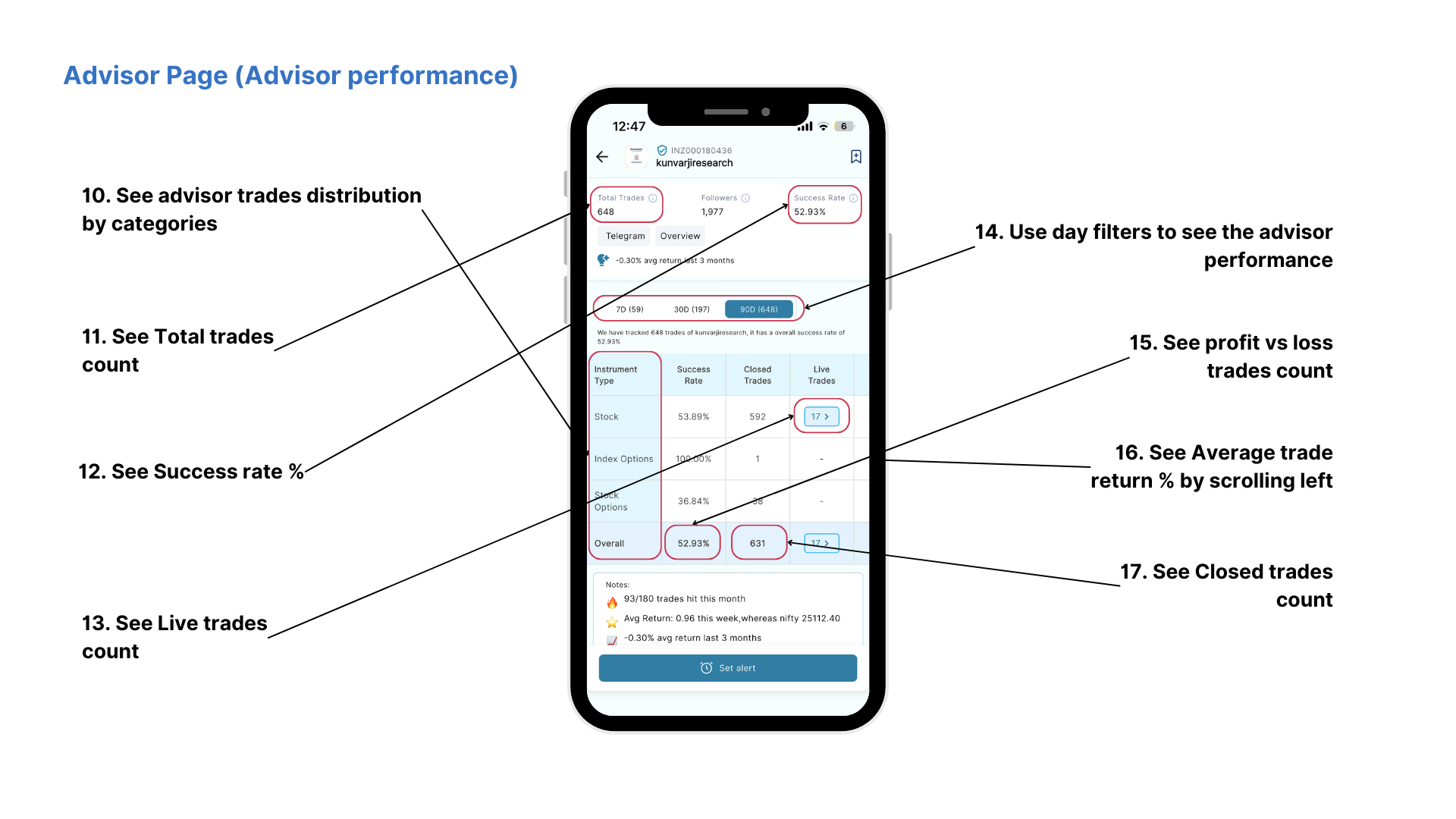 - Trades Tab: All ongoing and past recommendations from this advisor.