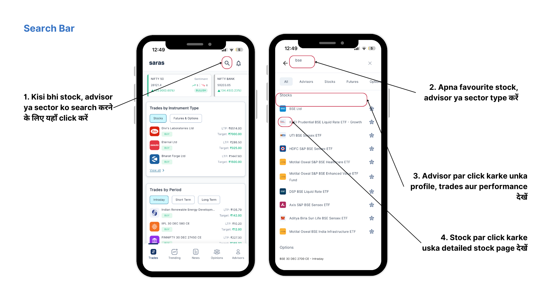 2. अपना पसंदीदा Stock, Advisor, या Sector टाइप करें
