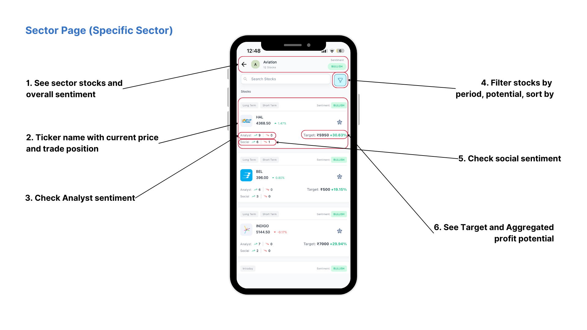 This page focuses on one sector at a time, showing all stocks within it along with their market sentiment, performance, and potential.