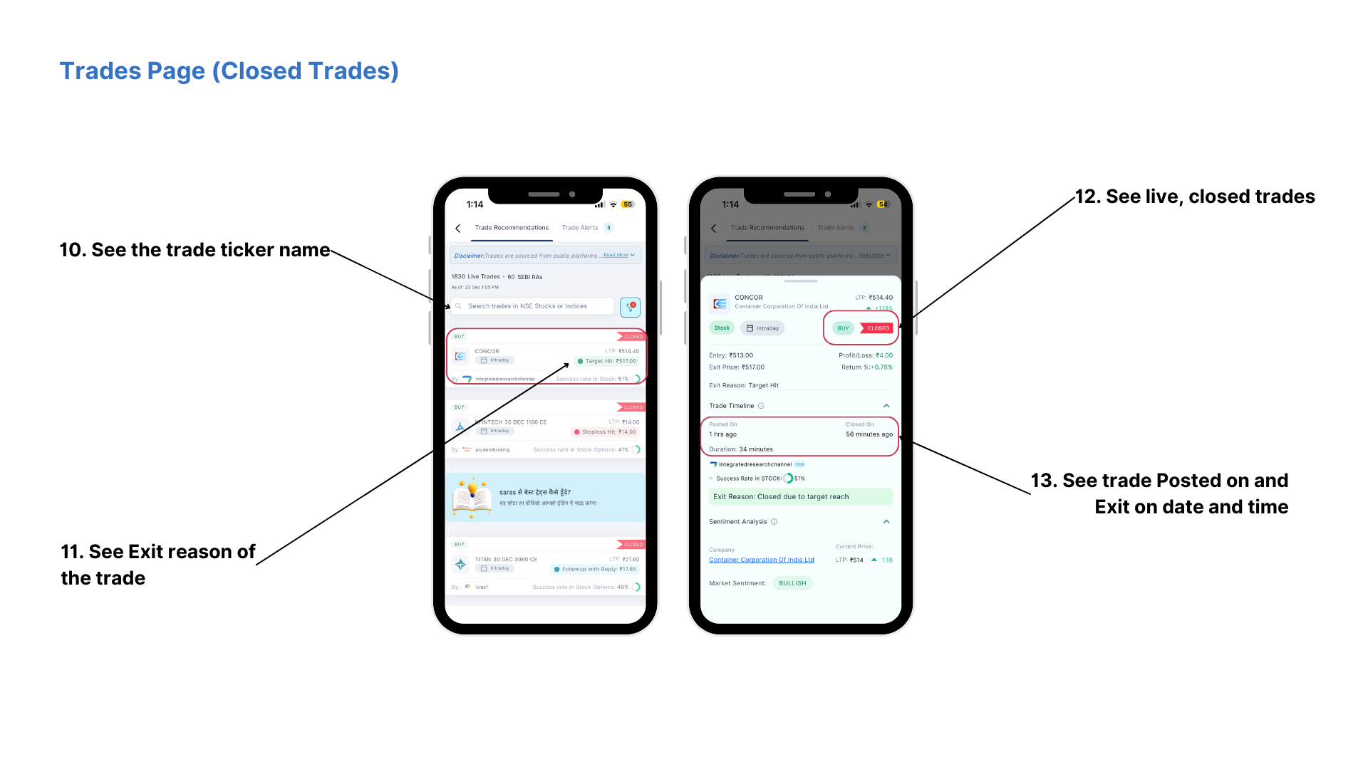 - Example: Target reached, Stop Loss hit, or Manual exit by advisor.